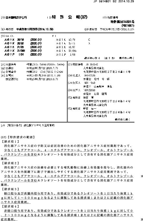 上記特許公報の請求項1では「消化器アニサキス症の「予防」又は・・・」
